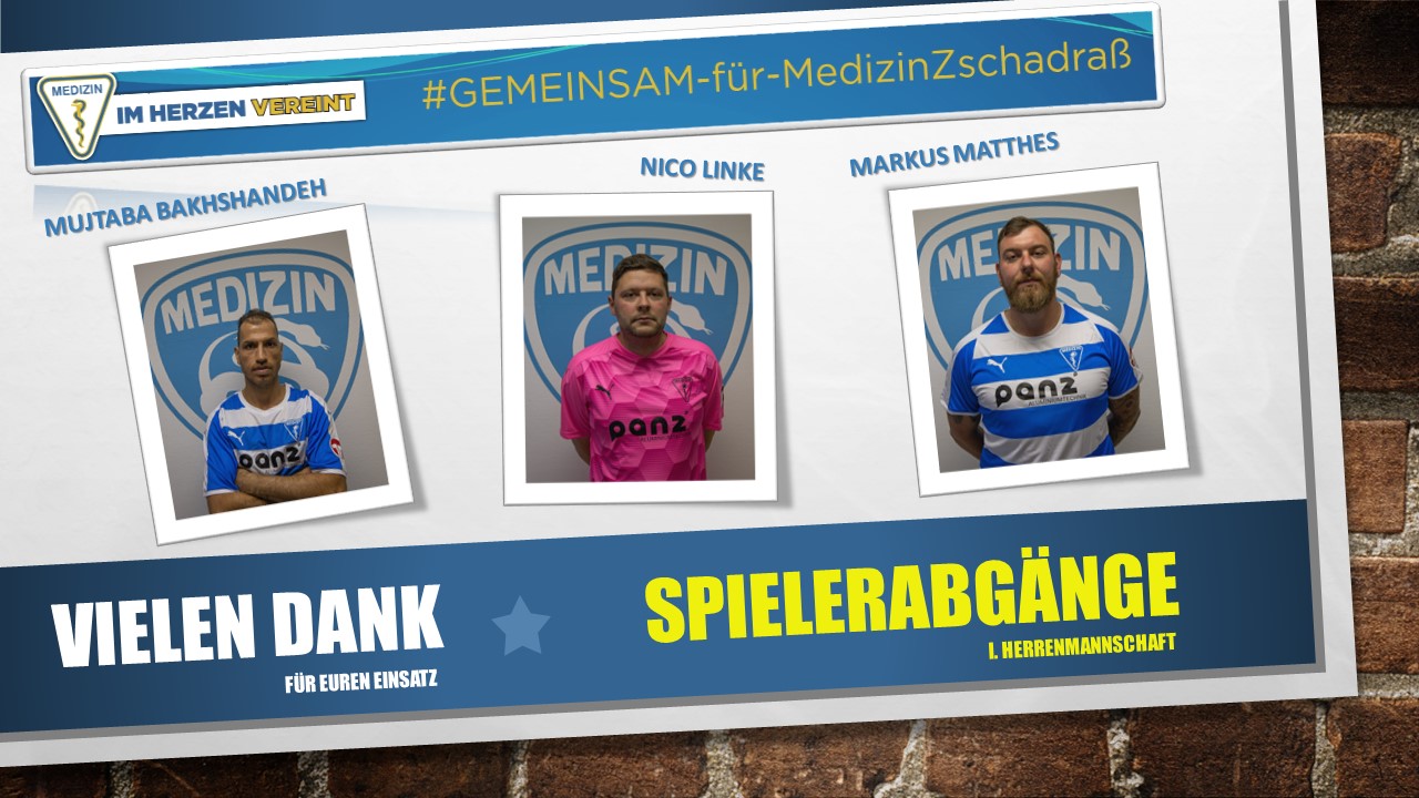 Der Blick auf die Veränderungen im Kader zeigt, dass sich dieser noch einmal ordentlich zur Vorsaison verändert hat. Folgende Ab- und Zugänge hat die 1. Mannschaft des SV Medizin Zschadraß zu verzeichnen. Abgänge: Marco Kretzschmar, Stephan Krauße (beide Alte Herren); Marcus Paul, Marcel Schülert, Markus Matthes (alle TuS Frisch Auf Hainichen); Sergio Waßill (SV Naunhof II); Mathias Wipper, Benjamin Maslic, Fabian Wenzel (alle unbekannt); Max Mühlner (vereinslos). Zugänge: Lukas Gerlach, Justin Härtel (beide HFC Colditz II), Oskar Dietze, Fynn Schramm, Valentin Stadler, Elias Schlender (alle eigene Jugend). Unser Verein dankt allen Spielern, die den Verein verlassen haben, für ihren Einsatz in den vergangenen Jahren und wünscht ihnen für ihre neuen sportlichen Herausforderungen viel Erfolg sowie alles Gute. Unseren neuen Spielern viel Erfolg im Team.