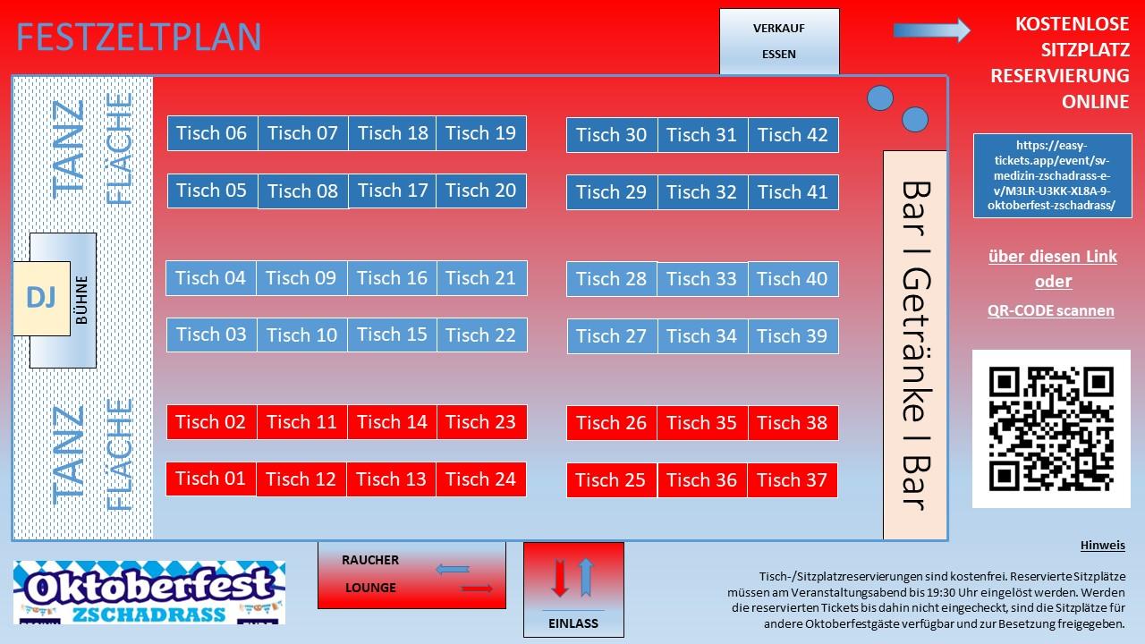 Sitzplatzreservierungen erfolgen ausschließlich über diese Online-Reservierungsplattform. Die Sitzplätze sind limitiert. Ihr könnt hier gleich mehrere Tickets kostenlos reservieren. Es werden je Tisch 10 Plätze ohne feste Sitzplatznummer vergeben. Am Tisch selbst herrscht also freie Platzwahl. Bitte beachtet, dass die Tisch- bzw. Sitzplatzreservierungen am Veranstaltungstag bis spätestens 19:30 Uhr eingelöst werden müssen. Werden die reservierten Sitzplätze bis 19:30 Uhr nicht eingelöst, sind sie automatisch frei verfügbar auch für andere Oktoberfestgäste. Nicht reservierte Sitzplätze sind automatisch am Veranstaltungstag frei nutzbar. Die Rückgabe oder Stornierung sowie Änderung reservierter Sitzplätze erfolgt per E-Mail an info@medizin-zschadrass.com. Allgemeiner Hinweis: 18+ Event, unter 18 Jahre entsprechend den gesetzlichen Bestimmungen, d.h. Muttizettel oder in Begleitung einer personensorgeberechtigten Person (Eltern).