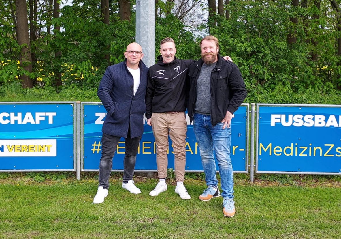 Rico Schulze (Mitte) präsentiert die neuen Trainer: Marcus Paul (links) & Marcel Schülert (rechts)